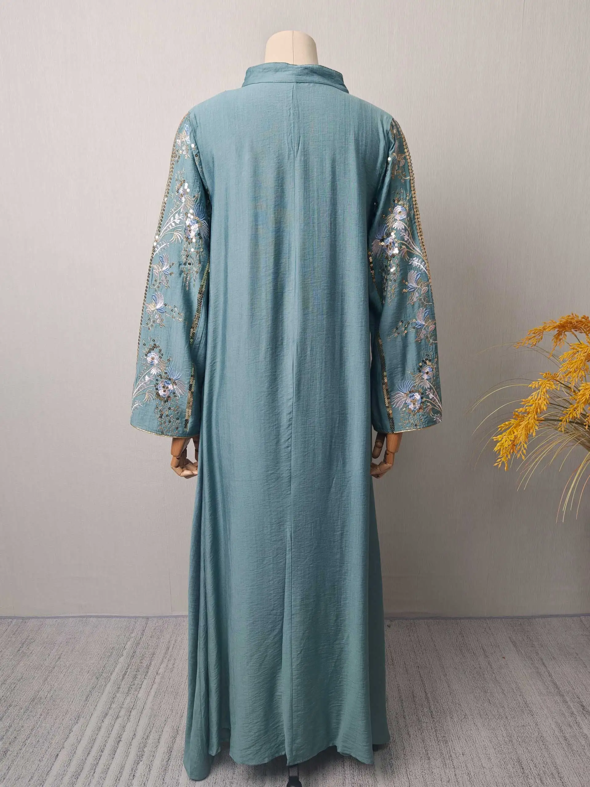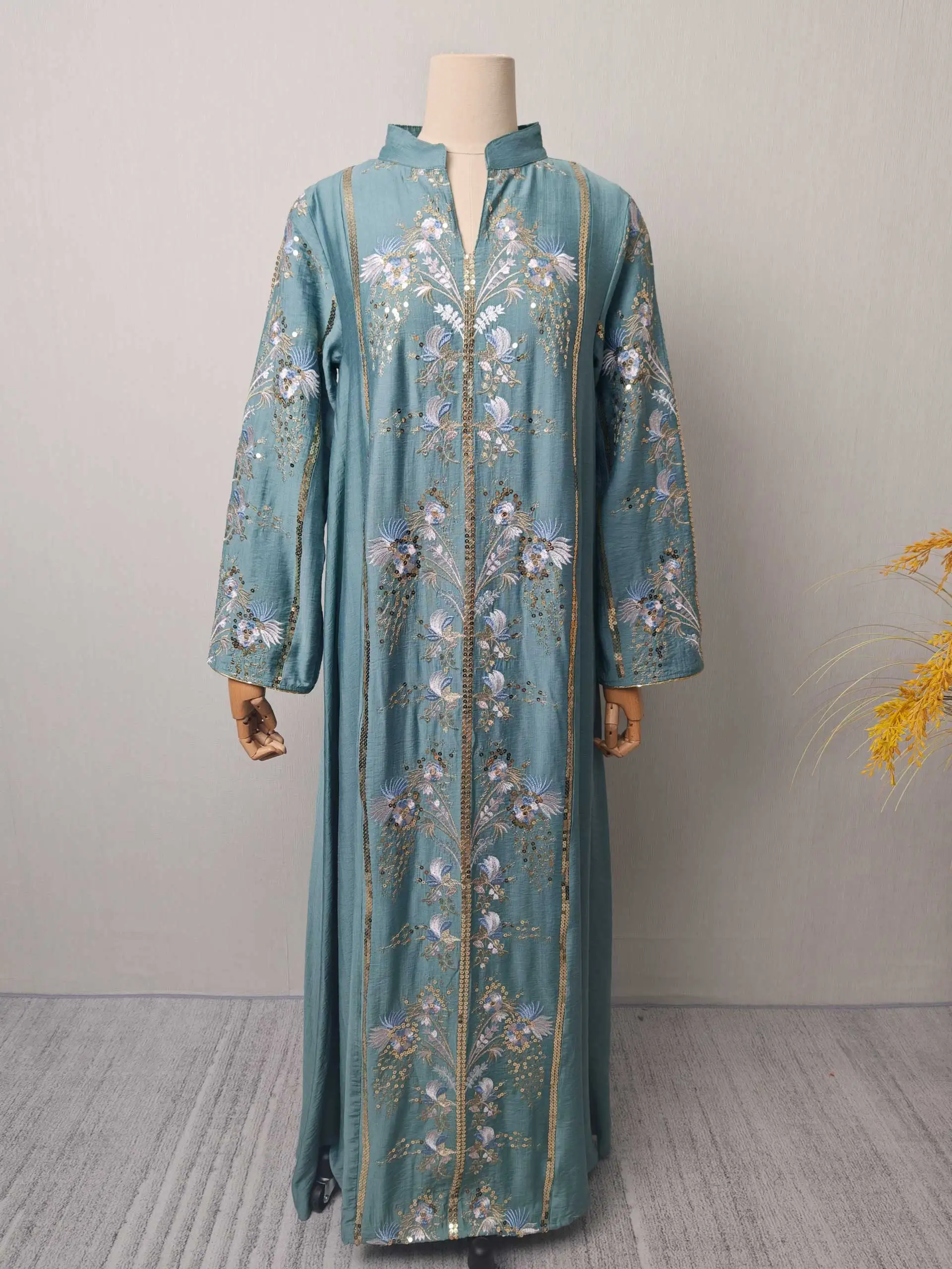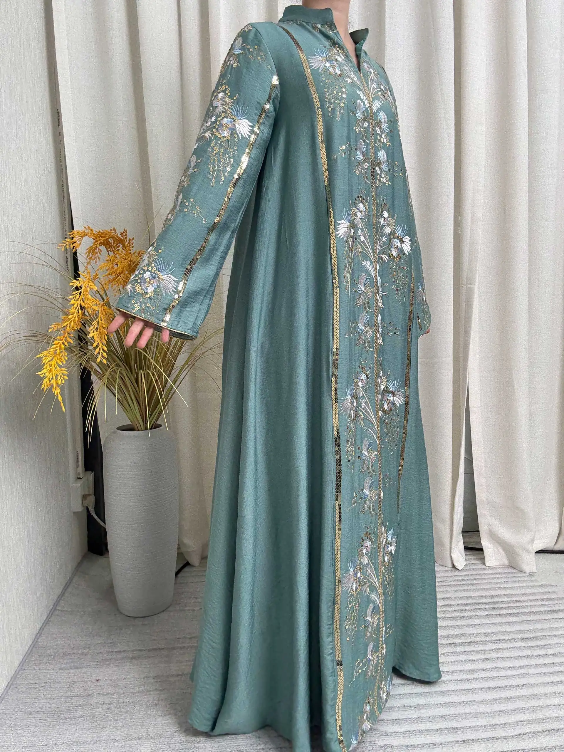 2025 Teal Muslim Abaya with Stand Collar and Exquisite Floral Embroidery Ideal for Islamic Festivities and Ramadan Celebrations