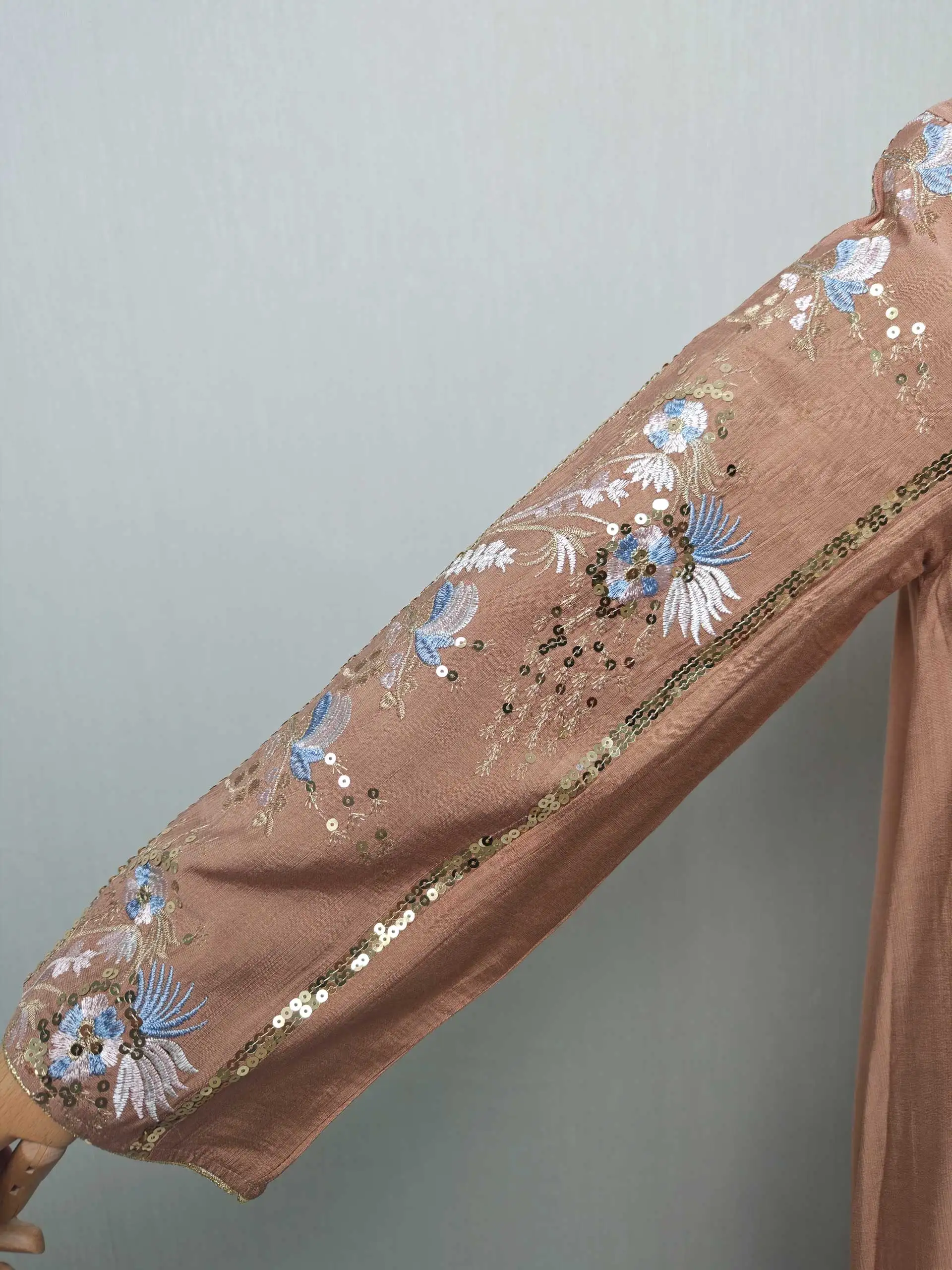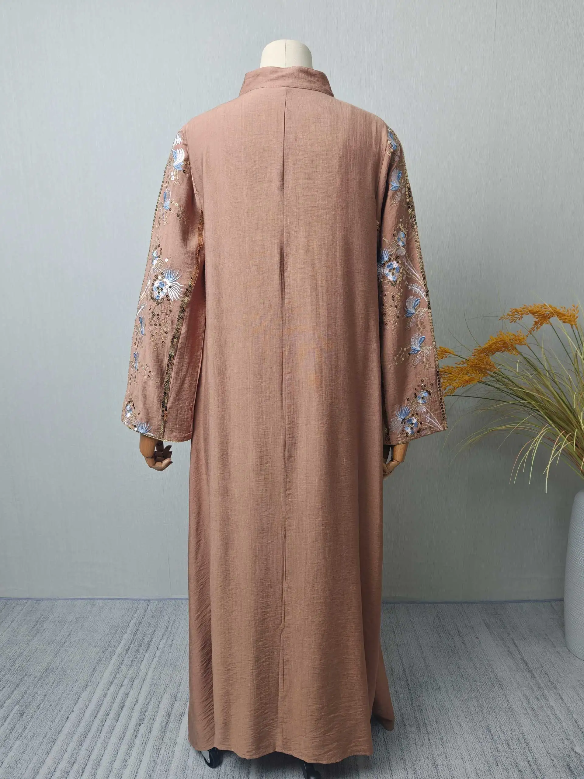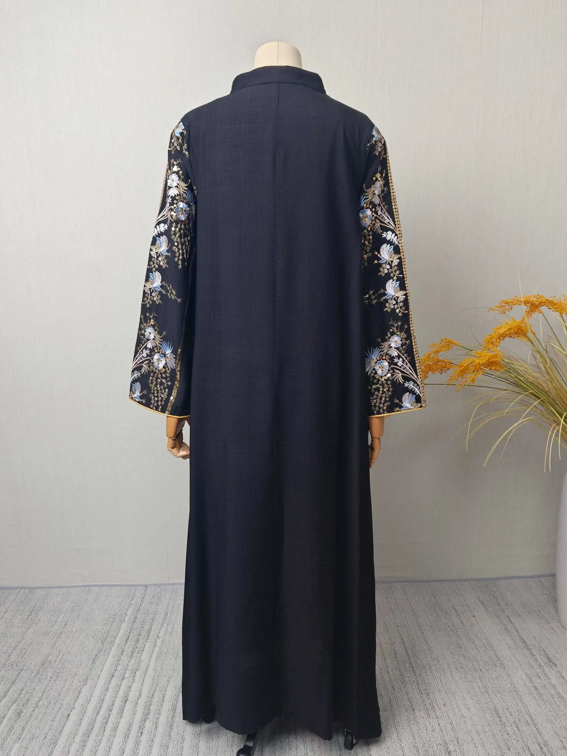 2025 Teal Muslim Abaya with Stand Collar and Exquisite Floral Embroidery Ideal for Islamic Festivities and Ramadan Celebrations