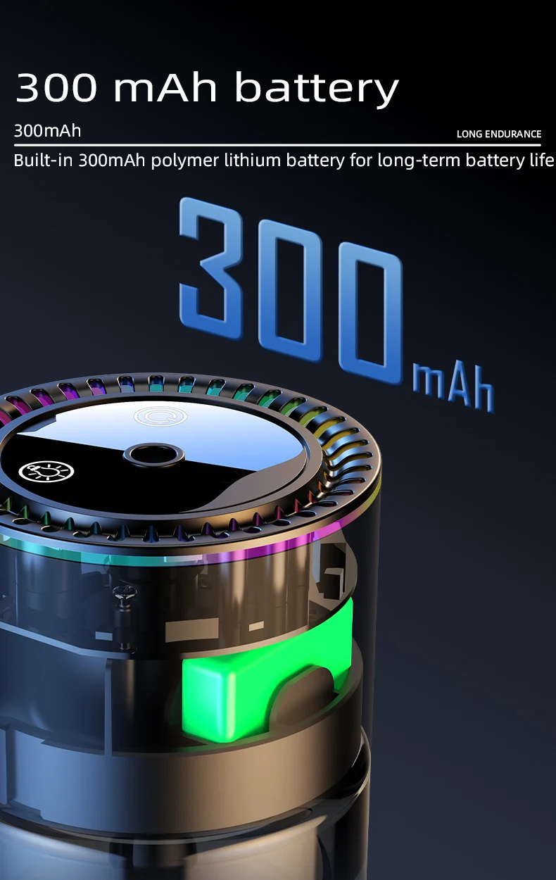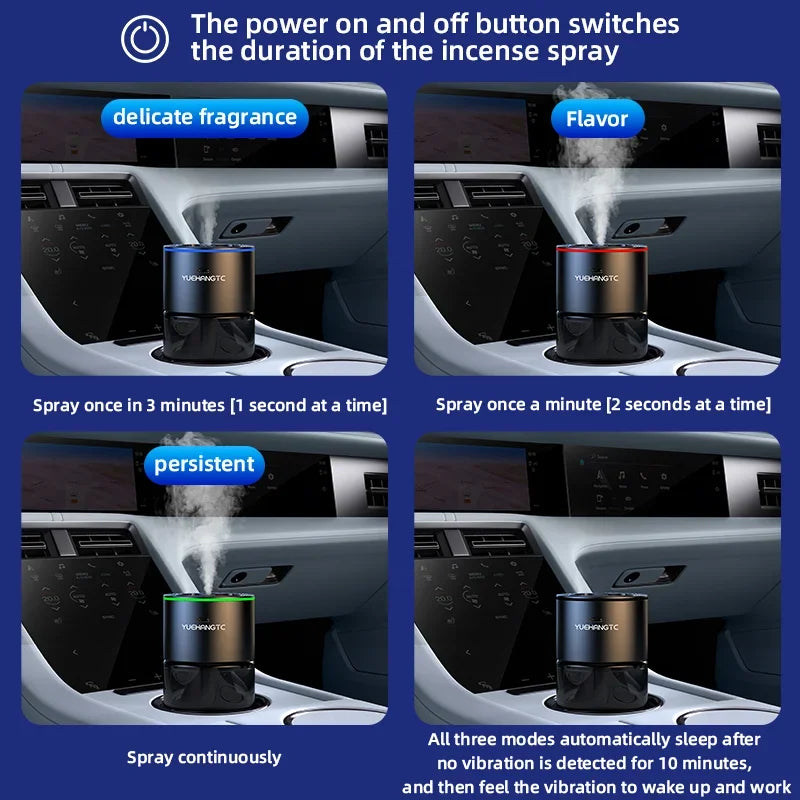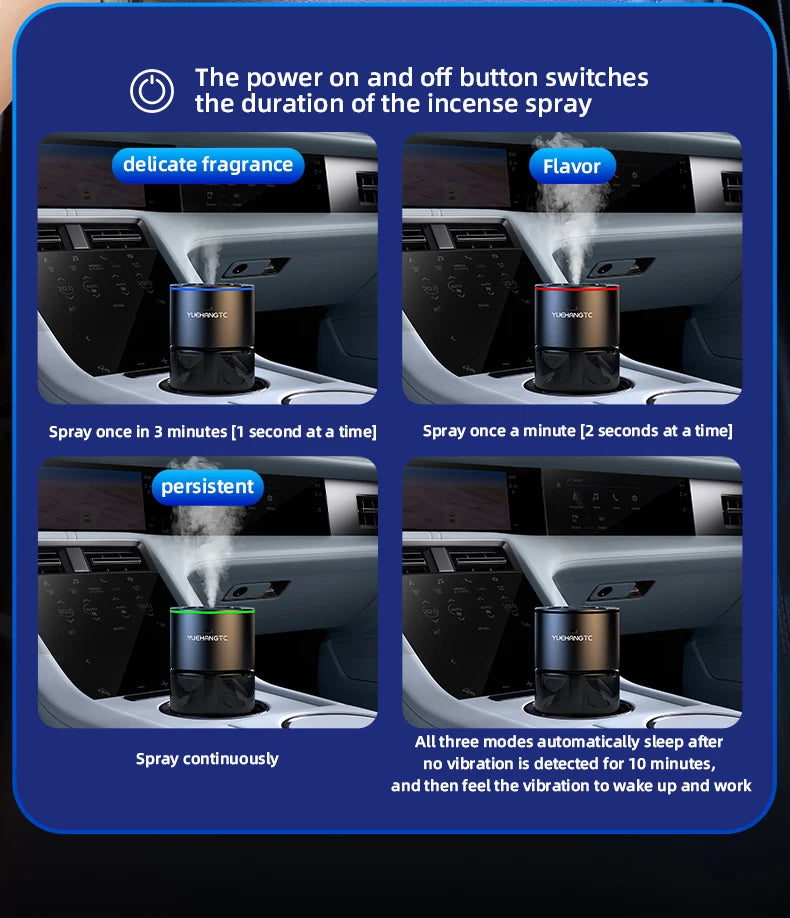 1.5 Adjustable Modes: The smart car air freshener is equipped with ambient lights and provides five spray modes with adjustable spray intervals to meet different fragrance needs. Level 1, spray for 2 seconds every 30 seconds. Level 2, spray for 2 seconds every 60 seconds. Level 3, spray for 2 seconds every 300 seconds.Level 4, spray for 2 seconds every 600 seconds.Level 5, spray for 300 seconds every 60 seconds.