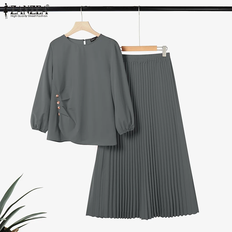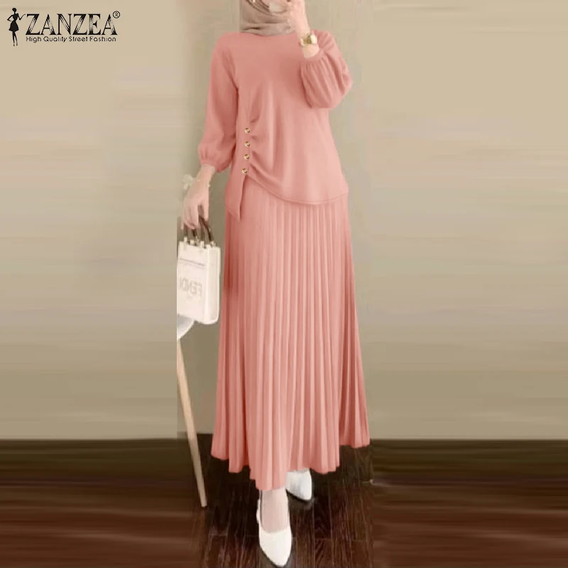 Fashion Muslim Sets Women 2PCS Outfits ZANZEA Elegant Long Sleeve Blouse Dress Suits Casual Solid Tracksuits Loose Matching Sets