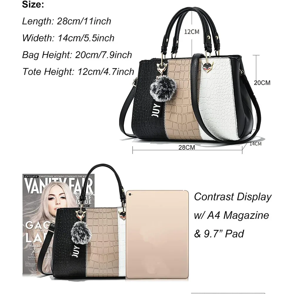 Elegant simple contrast color wave design. The bag comes with an adjustable and detachable strap shoulder strap and also a handle. You can use it as a shoulder bag or handbag. Metal feet protectors on the bottom.