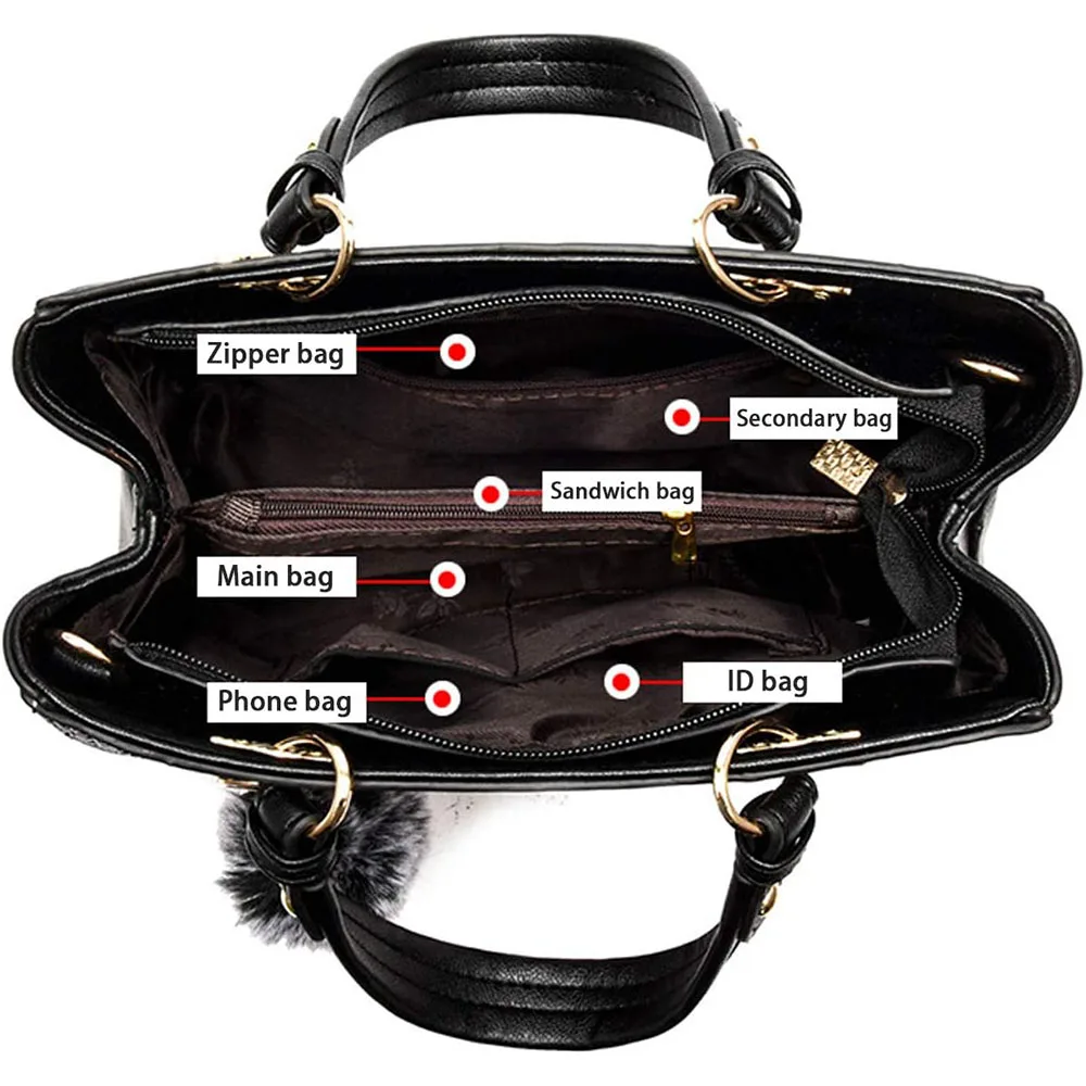 There are 2 main pocket compartments. 1 inner zip pocket. 2 open pockets for cards and phones. 1 hidden zip pocket. 1 anti-theft back pocket. Large capacity can hold an iPad Mini, bag and other things conveniently.