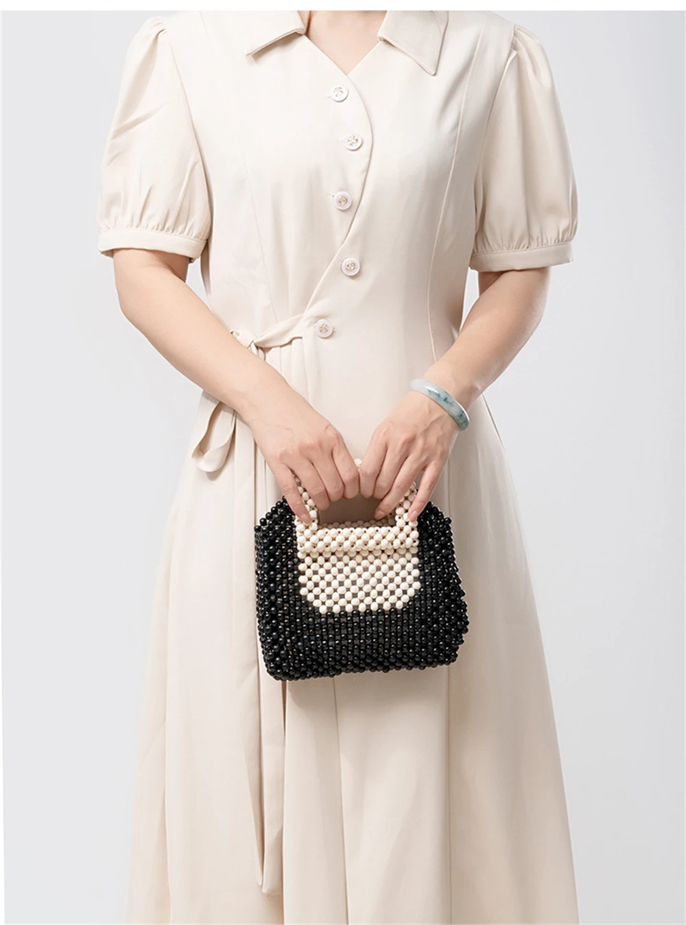 Luxury Wooden Beads Tote Bags Vintage Women's Square Handbag Handmade Fashion Banquet Bags Summer Casual Beach Purses Bag Bolsos