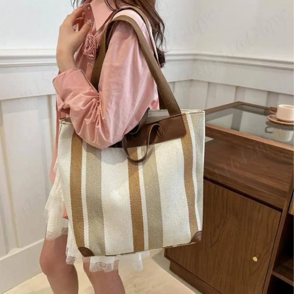Striped Shoulder Bucket Bags For Women Large Capacity Trendy Canvas Tote Bag Zipper Closure Casual Shopping Shoulder Bag Simple Commuting Bag for Work Travel