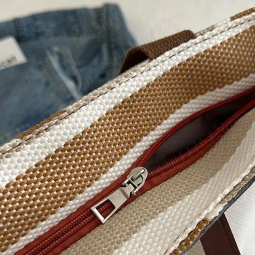 Striped Hobo Shoulder Bags Women Zipper Bucket Bags Canvas Tote Bag Simple Handbag Daily Commuting Bag Travel Top-Handle Bags