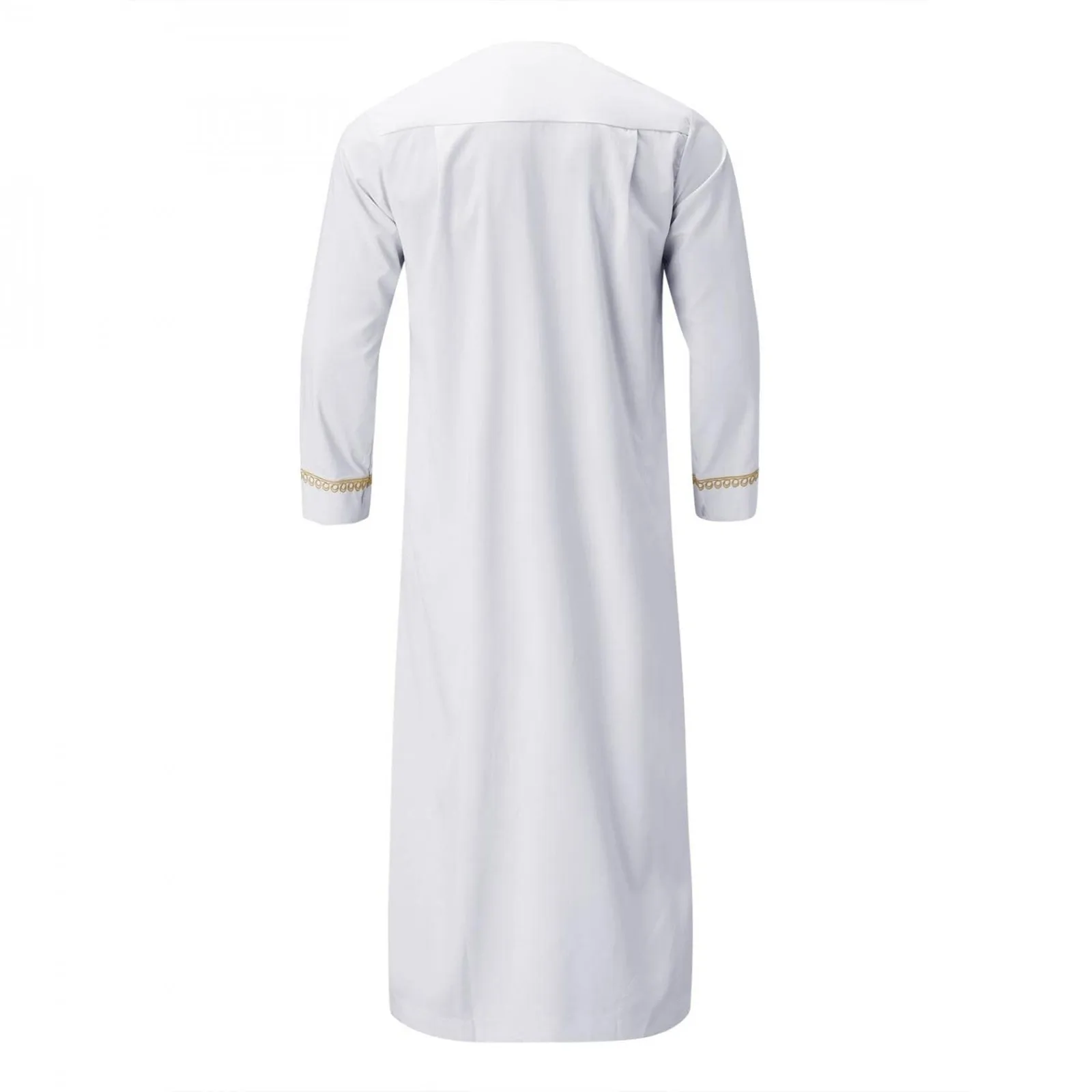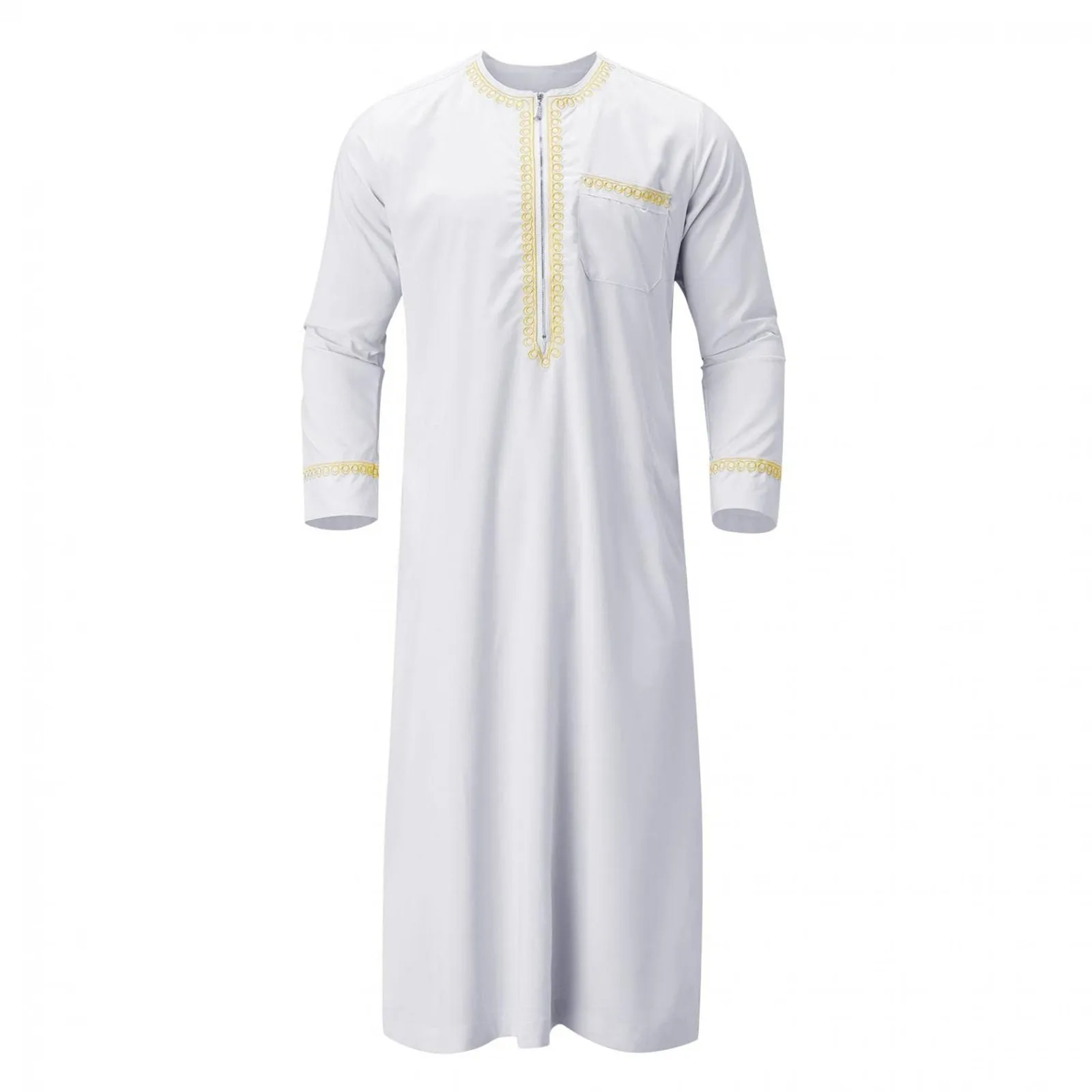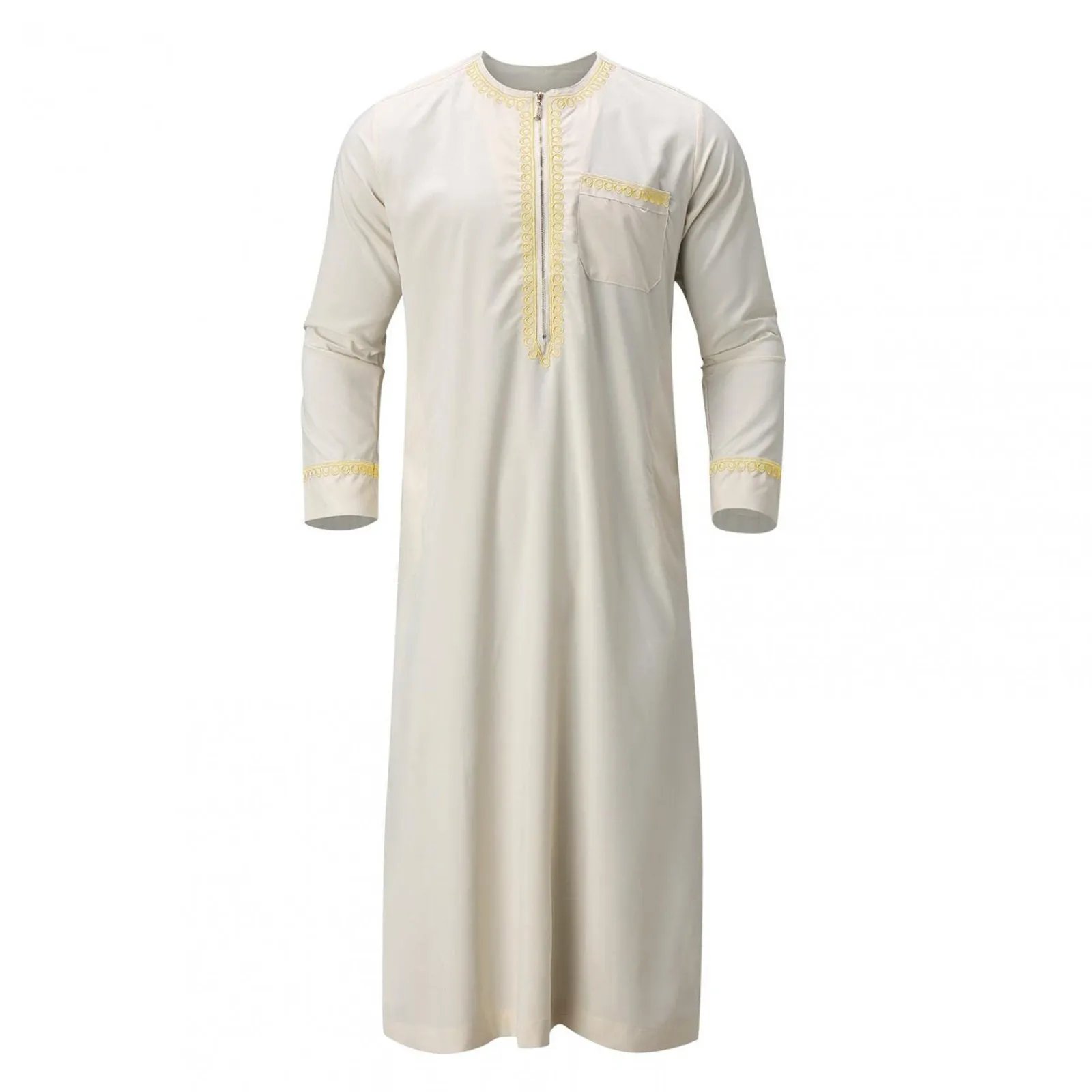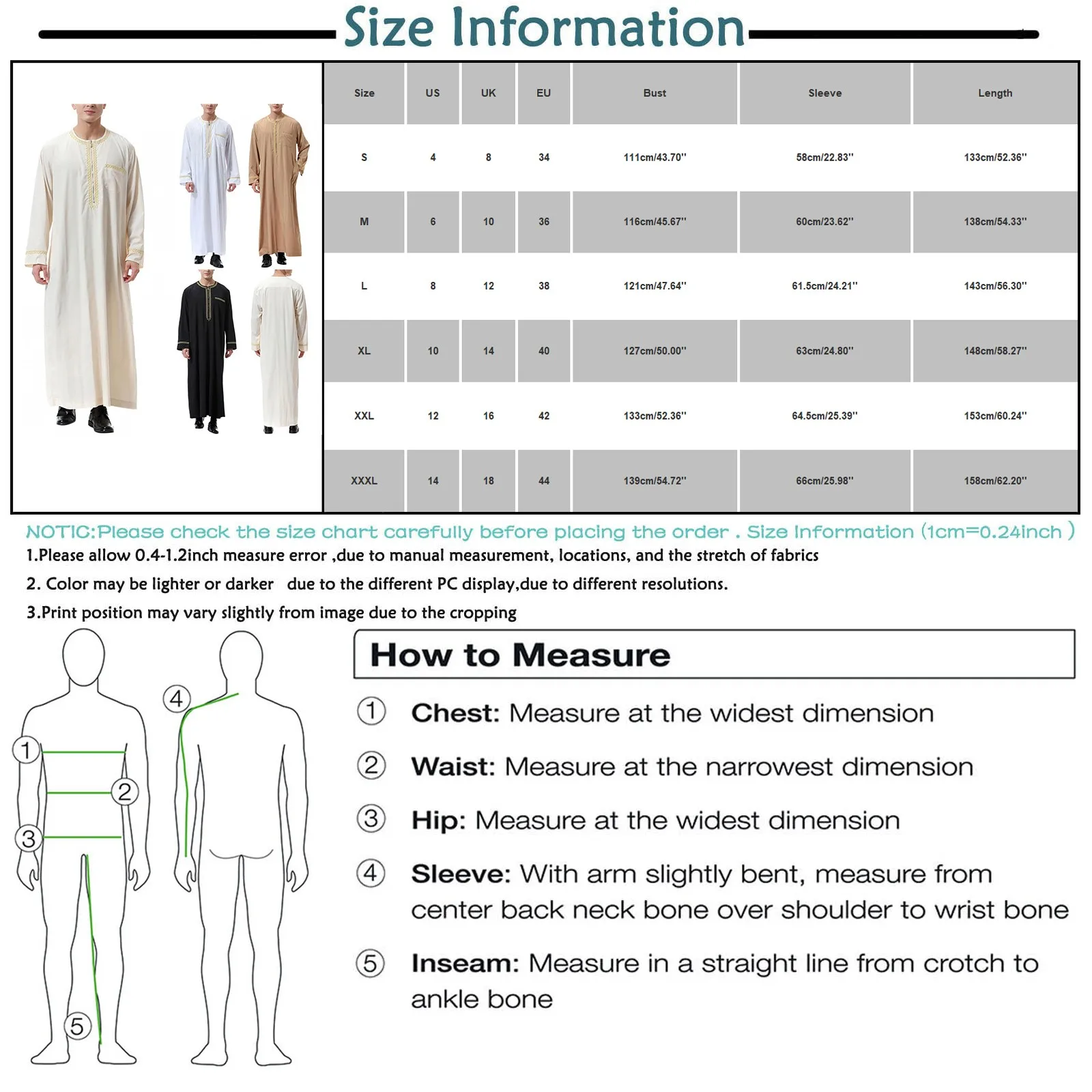 1.Men's medium kaftan with pockets, loose,O-neck, floor length, print neck, straight cut, zip front and long sleeve design.